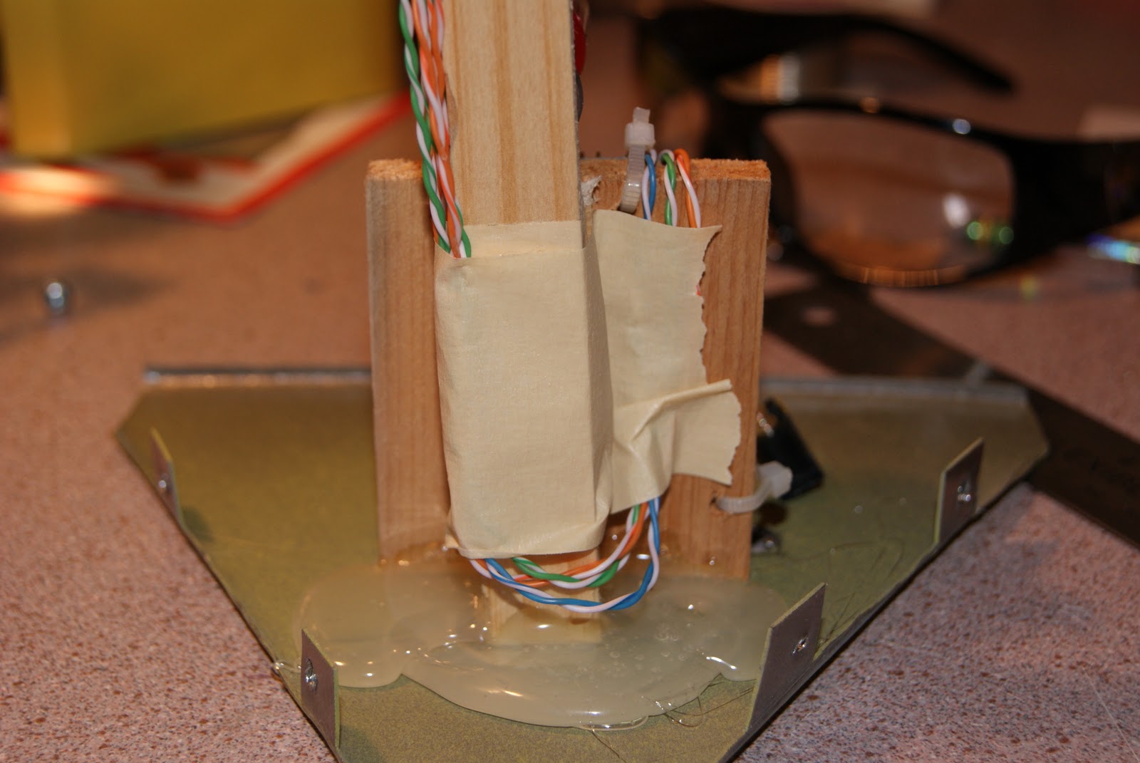 Next, I had to mount the LEDs inside the light. To do this, I attached them to a long, skinny piece of wood and hung it from the removable top. The wood is attached to the top using a screw and some glue. I made a wooden bracket to hold the electronics inside the light and cut holes for the ports in the top.